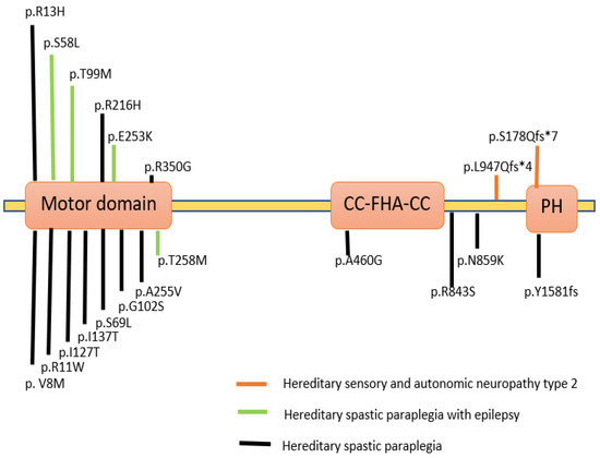 There are more than 80 genetically different types of HSP [40]. These types of spastic paraplegias are caused due to variations in the KIF1A gene and are referred to as an autosomal dominant type of Spastic Paraplegia (SPG30). The major symptoms include neurological difficulties, severe leg weakness, and spasticity [38,41,42]. The major sites of mutations in the human KAND protein are depicted in Figure 3.