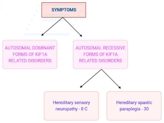 Variations in the KIF1A gene have been associated with various clinical conditions and are described in a database known as Online Mendelian Inheritance in Man (OMIM). Variants in KIF1A were studied in various neurodegenerative diseases with dominant and recessive inheritance (Figure 3). In patients suffering from severe neurodegenerative disorders, homozygous recessive mutations in the KIF1A gene were first described as hereditary sensory and autonomic neuropathy type 2 and as three consanguineous families with an autosomal recessive form of hereditary spastic paraplegia (HSP) with an autosomal dominant form of SPG30 [16]. A particular mutation p.T99M was reported in patients having an intellectual disability (ID), spasticity and axial hypotonia [17]. A partially overlapping phenotype-brain atrophy with progressive encephalopathy was recently found to be associated with de-novo KIF1A mutations [6]. Several de-novo variations and mutations in patients were classified as either pure or complicated. The complicated type is accompanied by axonal neuropathy and brain cerebellar atrophy [18,19].