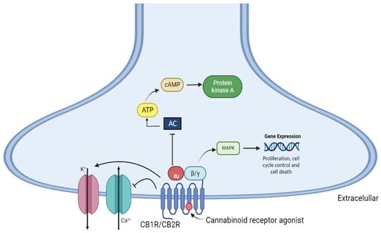 The activation of both cannabinoid receptors promotes adenylate cyclase inhibition in various cell types through coupling with the Gi/o protein. This leads to decreases in the levels of adenosine 3′,5′-monophosphate (cAMP) and protein kinase A activity (PKA), which may be associated with nociceptive neuron sensitization, and proteins that might be related to increased intracellular calcium, inositol triphosphate, and diacylglycerols, which are ultimately involved in the modulation of neurotransmitter release [77,78]. CB1R stimulation leads to the activation of the mitogen-activated protein kinase (MAPK) signaling pathway, including extracellular signal-regulated kinase 1/2 (ERK1/2), c-Jun N-terminal kinase (JNK), and p38, which are involved in the regulation of cell proliferation, cell cycle control, and cell death [46,79] (Figure 3).