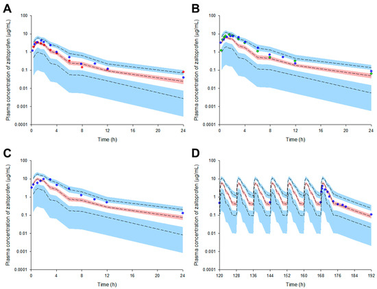 Simulation graphs of the pharmacokinetics of the final model for zaltoprofen according to single dose change ((A) 80 mg, (B) 160 mg, and (C) 240 mg) or multiple doses ((D) 80 mg). Observed concentrations after oral administration of 80–240 mg are depicted by the colored dots. The presented multiple exposure graph (D) is the simulation result for the observation area (120–192 h). The 95th, 50th, and 5th percentiles of the predicted concentrations are represented by black dashed lines. The 95% confidence intervals (CI) for the predicted 5th and 95th percentiles are represented by the blue-shaded regions. The 95% CI for the predicted 50th percentiles is represented by the red-shaded regions. The X-axis represents the time after oral zaltoprofen administration and the Y-axis is the observed and predicted zaltoprofen concentrations in the plasma. The red (A), blue (A–D), and green (B) dots represent mean data from Kang et al., (2006), Li et al., (2011), and Lee et al., (2006), respectively.
