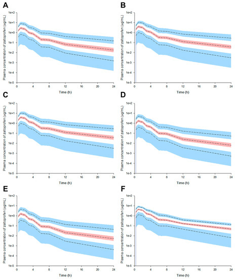 Pharmacokinetic prediction profiles after single oral administration of zaltoprofen (80 mg) according to the change in CrCL and albumin levels ((A) CrCL 130 mL/min, (B) CrCL 80 mL/min, (C) Albumin 5.5 g/dL, (D) Albumin 3.5 g/dL, (E) CrCL 130 mL/min and albumin 3.5 g/dL, and (F) CrCL 80 mL/min and albumin 5.5 g/dL). CrCL 130 and 80 mL/min and albumin 5.5 and 3.5 g/dL were randomly assigned to the upper and lower limits of the general range of healthy adults, respectively. The 95th, 50th, and 5th percentiles of the predicted concentrations are represented by black dashed lines. The 95% confidence intervals (CI) for the predicted 5th and 95th percentiles are represented by the blue-shaded regions. The 95% CI for the predicted 50th percentile is represented by the red-shaded regions. The X-axis indicates the time after oral zaltoprofen administration and the Y-axis is the predicted concentrations of zaltoprofen in the plasma.