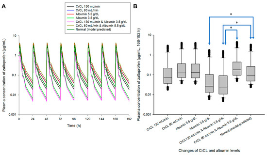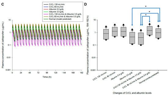 Simulation of pharmacokinetic prediction profiles after multiple (24 h (A,B) and 8 h intervals (C,D)) oral administrations of zaltoprofen (80 mg) according to the change in CrCL and albumin levels. The lines in the graph (A,C) indicate the mean values corresponding to 50% of each group. Normal in the graph is the 50% average predicted by the model established in this study (based on the group with median values of CrCL and albumin of 104.38 mL/min and 4.90 g/dL, respectively). A comparison (B,D) of predicted intergroup plasma concentrations at steady-state (168–192 h (B) and 184–192 h (C)) following changes in CrCL and albumin levels. * indicates a statistically significant difference between groups with p < 0.05.
