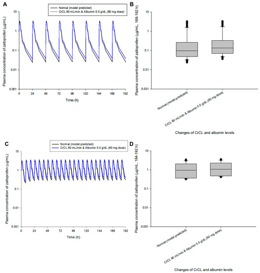 Simulation of the pharmacokinetic prediction profile after multiple (24 h (A,B) and 8 h intervals (C,D)) oral administrations of zaltoprofen predicted by arbitrarily adjusting the dose to 60 mg for the group with CrCL and albumin levels of 80 mL/min and 5.5 g/dL, respectively. The lines in the graph (A,C) indicate the mean values corresponding to 50% of each group. Normal in the graph indicates the 50% average predicted by the model established in this study (based on the group with median values of CrCL and albumin of 104.38 mL/min and 4.90 g/dL, respectively). Comparison (B,D) of predicted intergroup plasma concentrations at steady-state (168–192 h (B) and 184–192 h (C)) following a dose change of zaltoprofen to 60 mg for a group with CrCL and albumin levels of 80 mL/min and 5.5 g/dL, respectively.