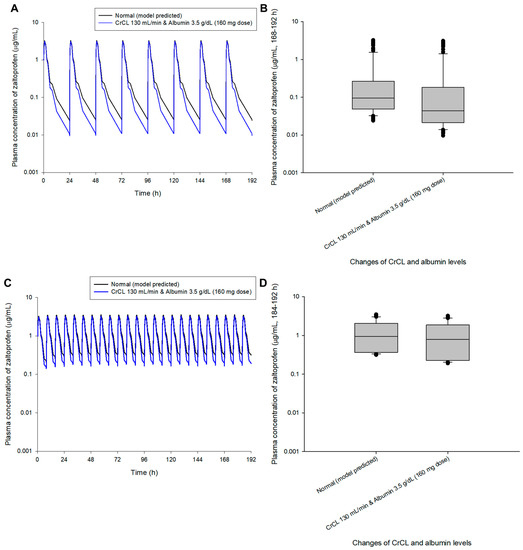 Simulation of the pharmacokinetic prediction profile after multiple (24 h (A,B) and 8 h intervals (C,D)) oral administrations of zaltoprofen predicted by arbitrarily adjusting the dose to 160 mg for the group with CrCL and albumin levels of 130 mL/min and 3.5 g/dL, respectively. The lines in the graph (A,C) indicate the mean values corresponding to 50% of each group. Normal in the graph indicates the 50% average predicted by the model established in this study (based on the group with median values of CrCL and albumin of 104.38 mL/min and 4.90 g/dL, respectively). Comparison (B,D) of predicted intergroup plasma concentrations at steady-state (168–192 h (B) and 184–192 h (C)) following a dose change of zaltoprofen to 160 mg for a group with CrCL and albumin levels of 130 mL/min and 3.5 g/dL, respectively.