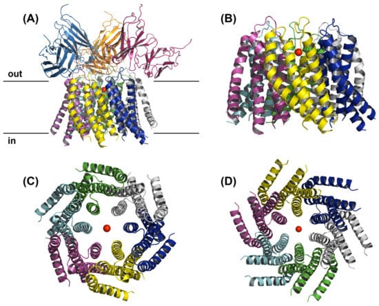 The hexameric Orai channel structure. The figure illustrates a side view of the overall structure of Orai channel complex from the perspective of the membrane (A), a side view of just the four TMs (B), a top view (C), and intracellular view (D). Each subunit contains four transmembrane helices as represented in different colours. The red ball in the centre of the pore represents the Ca2+ ion.