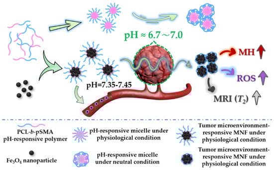 The following supporting information can be downloaded at: https://www.mdpi.com/article/10.3390/ph16020166/s1, Figure S1: Synthetic scheme of PCL-b-pSMA; Figure S2: 1H NMR spectrum of PCL; Figure S3: 1H NMR spectrum of PCL-DDMAT; Figure S4: Content of Fe3O4 in the tumor microenvironment-responsive MNF; Figure S5: Time-dependent hydrodynamic diameters of the tumor microenvironment-responsive MNF in physiological conditions; Figure S6: Particle sizes of the tumor microenvironment-responsive MNF in solutions with different pH values; Figure S7: Zeta potentials of the tumor microenvironment-responsive MNF in solutions with different pH values; Figure S8: Time-dependent temperature curves of the tumor microenvironment-responsive MNs under AMF with different Happlied.