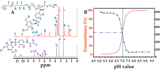 The final reaction was the RAFT polymerization for the preparation of the pH-responsive amphiphilic copolymer. In this study, we selected sulfadimethoxine acrylamide (SMA) as the pH-sensitive monomer, because the poly(methacryloyl sulfadimethoxine) showed a pKa at approximately 7.0 in a relevant study [24]. Utilizing DMSO-d6 as a solvent, we characterized the structures of the PCL-b-pSMA and SMA, as shown in Figure 2. According to previous studies [24,26,27], all of the characteristic peaks of the SMA were identified and marked in Figure 2A (bottom spectrum). Based on the 1H NMR results of the SMA (Figure 2A, bottom spectrum) and PCL-DDMAT (Figure S3), we further identified all of the characteristic peaks of the PCL-b-pSMA, also shown in Figure 2A (top spectrum). Apparently, because of the polymerization of SMA, the characteristic peaks of the acrylamide in the SMA disappeared; meanwhile, all of the characteristic peaks of the SM broadened. In addition to the characteristic peaks of SM, the characteristic peaks of PCL can also observed in Figure 2A (top spectrum), which confirms the successful polymerization of SMA as a product of the PCL-DDMAT.