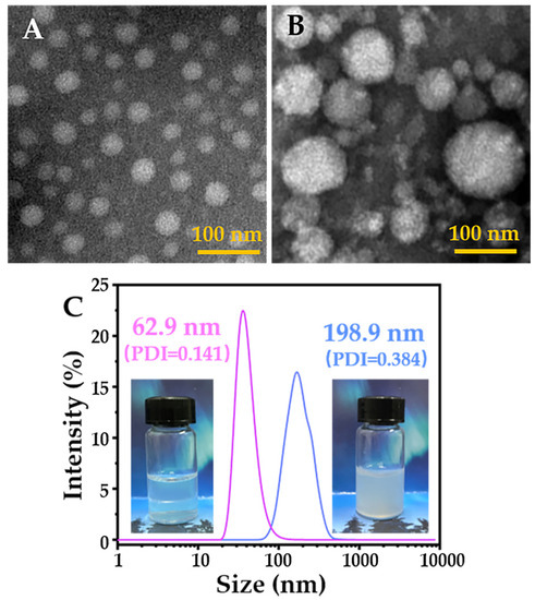 Morphologies (TEM) and particle size distributions (DLS) of PCL-b-pSMA micelles in the aqueous phase (0.3 mg mL−1) with different pH values: (A) TEM result of PCL-b-pSMA micelles in the buffer with a physiological pH value (pH = 7.43); (B) TEM result of PCL-b-pSMA micelles in neutral buffer (pH = 7.05); (C) DLS results of the samples in (A,B).