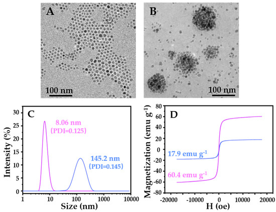 Characterization of the Fe3O4 nanoparticles and MNF, including the morphologies (TEM), particle size distributions (DLS) and magnetic properties (magnetic hysteresis loops): (A) TEM result of the hydrophobic Fe3O4 nanoparticles in hexane (0.1 mg mL−1); (B) TEM result of the MNFs in alkaline buffer (pH ≈ 9.0, 0.5 mg mL−1); (C) DLS results of the samples in (A,B); (D) magnetic properties of the desiccative Fe3O4 nanoparticles (60.4 emu g−1) and MNF (17.9 emu g−1).
