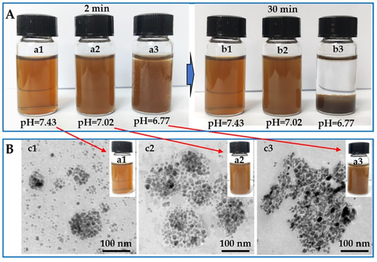 Corresponding to a pKa value of the PCL-b-pSMA, the MNF could disperse very well in the aqueous phase with a physiological pH value (pH ≈ 7.43), forming a transparent brown liquid in the macroscopic state. Furthermore, we assessed the long-term stability of the MNF (1~13 d) under a physiological pH value (≈7.43), as shown in Figure S5, which confirmed its high colloidal stability under physiological conditions. At the same time, the MNF solution with a neutral pH value (pH ≈ 7.02) became a dark-brown liquid at the macroscopic level. With the further decrease in the pH value, the MNF lost its colloidal stability in the solution with weak acidity (pH ≈ 6.77), as shown in Figure 5A; many sediments could be observed after adjusting the pH to 6.77 for 2 min. With the prolonged observation time of 30 min, in physiological and neutral conditions, the MNF maintained its original states; however, the MNF in a weak acidic environment dropped completely to the bottom of the container. In addition to the differences at the macroscopic level, the MNF solutions with corresponding pH values for 2 min also showed quite different microscopic morphologies, as shown in Figure 5B. The MNF in the aqueous phase with pH = 7.43 exhibited a similar morphology as the TEM result in Figure 4B, indicating its colloidal stability under the physiological conditions again. However, in a neutral environment, several micellar MNF formed a large Fe3O4 cluster, as shown in Figure 5B, resulting in the low transmittance of the sample. When the surrounding pH value was downregulated to weak acidity (pH ≈ 6.77), many Fe3O4 nanoparticles piled up chaotically, also shown in Figure 5B, because the surrounding pH value was lower than the pKa of the PCL-b-pSMA. In addition to the macroscopic states and microscopic morphologies, we also quantified the diameters (Figure S6) and zeta potentials (Figure S7) of the MNF in solutions with corresponding pH values, which are shown in Figures S6 and S7. Apparently, in a neutral and weak acid solution, the MNF not only displayed larger diameters but also showed higher surface potentials (negative charge) compared to their counterparts in a physiological environment. According to these results, the MNF exhibited a similar pH responsiveness with a neutral pH value, which can be ascribed to the pKa of the PCL-b-pSMA. Considering a tumor microenvironment pH value (7.1~6.7) [13], the tumor microenvironment-responsive MNF should possess a potential for targeted accumulation in a tumor stroma.