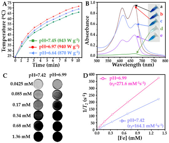 The effect of the tumor microenvironmental pH value on the tumor microenvironment-responsive MNF’s applications, including (A) enhanced MH with a concentration of Fe at 100 μg mL−1; (B) increased ROS generation with the concentration of the MNF at 250 μg mL−1; (C,D) improved T2 relaxivity of the MRI with varied Fe concentrations from 1.36 to 0.0425 mM.