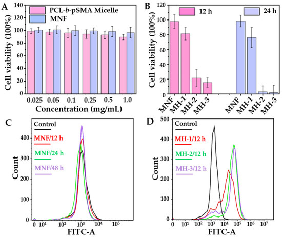 Cellular experiments on the biological effect of the MNF and MH, including the (A) biocompatibility of the PCL-b-pSMA micelles and MNF; (B) MH-induced cell death; intercellular ROS generation by (C) MNF (D) and MH.