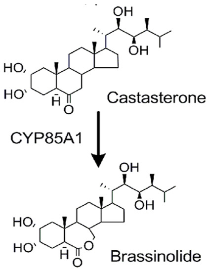 Brassinosteroids (BRs) are plant steroid hormones first identified in the pollen of rape (Brassica napus) with activity in promoting cell elongation [5]. Since then, BRs have been found throughout the plant kingdom [6], with many effects on plant growth, development, and stress response [7]. In contrast to animal hormones, which are typically made in a specific glandular location and exert effects elsewhere in the organism, plant hormones are usually made in many locations and can have local as well as distant effects. BRs are synthesized in all plant organs, in higher concentrations in the tissues of young plants. They are therefore consumed as part of the human diet, where their effects are unknown.