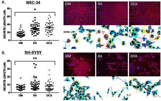 Neurite outgrowth measured as neurite length using NeuronCyto II. (A) NSC-34 exposed to basal medium (DM), 1 μM retinoic acid (RA), and 20 μM of the bile acid deoxycholic acid (DCA) for 6 days. Four microscopic fields (colored examples shown below the red/blue DAPI/immunostaining images) from each of ten 20X images (40 total fields) of each culture condition were processed, and neurite lengths calculated and plotted. RA and DCA resulted in increased neurite length in NSC-34 (Kruskal–Wallis statistic, * p < 0.0001). (B) SH-SY5Y cells NSC-34 exposed to basal medium (DM), 1 μM retinoic acid (RA), and 20 μM of the bile acid deoxycholic acid (DCA) for 6 days and analyzed as described in A for NSC-34 cells. RA and DCA resulted in increased neurite length in NSC-34 (Kruskal–Wallis statistic,** p = 0.0196).