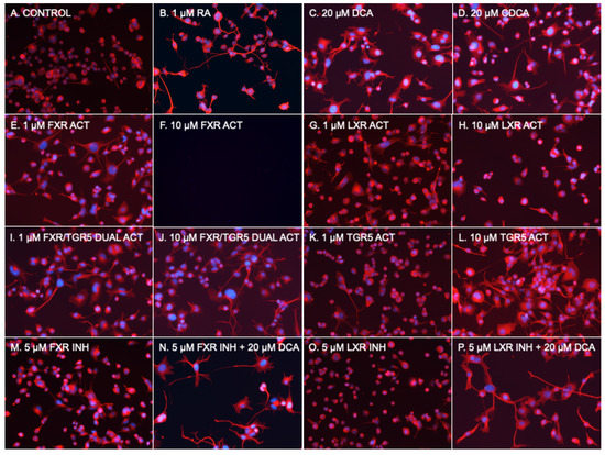 Photomicrographs of NSC-34 cells. (A) Basal medium. (B) 1 μM RA. (C) 20 μM DCA. (D) 20 μM CDCA. (E) 1 μM GW4064 (FXR Activator). (F) 10 μM GW4064 (FXR Activator). (G) 1 μM WAY 252623 (LXR activator). (H) 10 μM WAY 252623 (LXR activator). (I) 1 μM INT 747 (FXR/TGR5 dual activator). (J) 10 μM INT 747 (FXR/TGR5 dual activator). (K) 1 μM RG-239 (TGR5 activator). (L) 10 μM RG-239 (TGR5 activator). (M) 5 μM Z-Guggulsterone (FXR inhibitor). (N) 5 μM Z-Guggulsterone (FXR inhibitor) + 20 μM DCA. (O) 5 μM GSK 2033 (LXR inhibitor). (P) 5 μM GSK 2033 (LXR inhibitor) + 20 μM DCA.