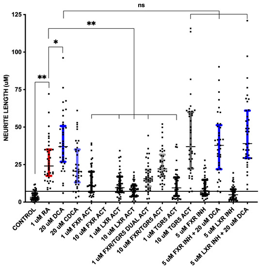 Neurite outgrowth measured as neurite length, as described in Figure 1, from cells in Figure 2. The horizontal line at ~8 μm is drawn through + 1 standard deviation of control neurite length measurements. The conditions in which 1 standard deviation did not overlap with control (i.e., above horizontal line) are colored: 1 μM RA in red, 20 μM DCA in dark blue, 20 μM CDCA in light blue, 1 μM INT 747 (FXR/TGR5 dual activator) in light gray, 10 μM INT 747 (FXR/TGR5 dual activator) in light gray, 10 μM RG-239 (TGR5 activator) in dark gray, 5 μM Z-Guggulsterone (FXR inhibitor) + 20 μM DCA in dark blue and 5 μM GSK 2033 (LXR inhibitor) + 20 μM DCA in dark blue. * p < 0.01, ** p < 0.001, ns = not significant.