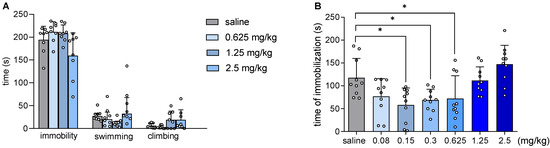 The experiment was performed on mice according to the method described by Porsolt et al., and as previously described [82,83]. Mice were placed individually in glass cylinders (height: 25 cm, diameter: 10 cm) filled with water at 24 ± 1 °C to a depth of 10 cm and were left there for 6 min. Following a 2 min habituation period, the total time spent immobile was recorded during the next 4 min. The animal was regarded as immobile when it remained floating passively in the water, making only small movements to keep its head above the water. The experiments were video-recorded and scored using elevenmaze.com software by a trained observer blind to the treatment.