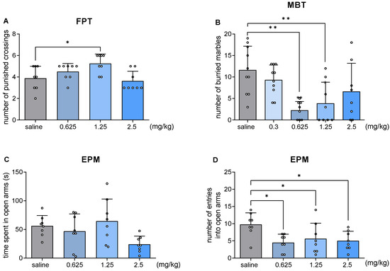 The influence of JJGW07 on the number of punished crossings (Panel (A)), the number of buried marbles (Panel (B)), and time spent in the open arms (Panel (C)), as well as the number of entries into open arms (Panel (D)). (A) Mice were placed in the four-plate apparatus, and after a 15 s adaptation period, each crossing from one plate to another was punished by an electric shock. The number of punished crossings was measured for 60 s. (B) Mice were placed individually in cages with a 5 cm bedding layer, where 20 glass balls were placed. The number of buried marbles after 30 min of the test was counted. (C,D) In the elevated plus maze test, mice were placed individually in the center area of the maze and observed for 5 min. The number of entries into the open arms, as well as the time spent in the open arms, was measured. JJGW07 was administered intraperitoneally (ip) 30 min before the test. The control group received an injection of 0.9% NaCl (ip). Values are expressed as means ± SD; n = 8 mice per group. Statistical analysis: one-way ANOVA (Newman–Keuls post hoc), * p < 0.05, ** p < 0.01 vs. control group, FPT—the four-plate test, MBT—the marble-burying test, and EPM—the elevated plus maze test.