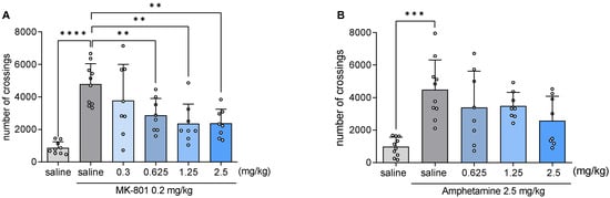 The effect of JJGW07 on the MK-801-induced (Panel (A)) and amphetamine-induced (Panel (B)) hyperlocomotion in mice. Locomotor activity was recorded in actometers separately for each mouse. After 30 min of adaptation, the number of crossings of photobeams was measured during 60 min. JJGW07 was administered intraperitoneally (ip) 30 min before the test. MK-801 (0.2 mg/kg, ip) was administered 15 min before the experiment, while amphetamine (2.5 mg/kg) was administered subcutaneously (sc) 30 min before the experiment. The control groups received either two injections of 0.9% NaCl (ip or sc), or 0.9% NaCl (ip) and MK-801 (ip), or 0.9% NaCl (ip) and amphetamine (sc). Values are expressed as means ± SD; n = 8–10 mice per group. Statistical analysis: one-way ANOVA (Newman–Keuls post hoc); ** p < 0.01, *** p < 0.001, **** p < 0.0001.