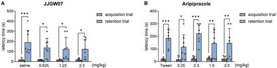 The influence of JJGW07 (Panel (A)) and aripiprazole (panel (B)) on the latency in the step-through passive avoidance task in mice. The experiment consisted of two sessions. In the acquisition trial, mice were placed individually in the light chamber of the apparatus, with the door opening after 30 s. When the animal crossed to the dark chamber, the door closed and the animal was punished with an electric shock (0.8 mA, 2 s). JJGW07 and aripiprazole were administered intraperitoneally (ip) 30 min before the start of the experiment. The control group received an ip 0.9% NaCl solution or 1% Tween. On the second day of the test, the mice were placed again in a bright chamber and the latency was measured for a maximum of 300 s (without the electrical impulse). Values are expressed as means ± SD; n = 8 mice per group. Statistical analysis: two-way ANOVA with repeated measures (Bonferroni post hoc); * p < 0.05, ** p < 0.01, *** p < 0.001 vs. acquisition trial.