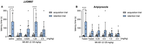 The influence of JJGW07 (Panel (A)) and aripiprazole (Panel (B)) on the latency after the MK-801 administration in the step-through passive avoidance task in mice. The experiment consisted of two sessions. In the acquisition trial, mice were placed individually in the light chamber of the apparatus, with the door opening after 30 s. When the animal crossed to the dark chamber, the door closed and the animal was punished with an electric shock (0.8 mA, 2 s). JJGW07 and aripiprazole were administered intraperitoneally (ip) 30 min before the test, while MK-801 (0.125 mg/kg) was administered ip 15 min before the start of the experiment to induce the memory impairments. The control group received an ip 0.9% NaCl/1% Tween solution in two injections or 0.9% NaCl/1% Tween solution and MK-801 (0.125 mg/kg; ip). On the second day of the test, the mice were placed again in a bright chamber and the latency was measured for a maximum of 300 s (without the electrical impulse). Values are expressed as means ± SD; n = 8 mice per group. Statistical analysis: two-way ANOVA with repeated measures (Bonferroni post hoc); *** p < 0.001, **** p < 0.0001 vs. acquisition trial.