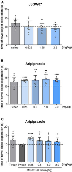 The influence of JJGW07 (Panel (A)) and aripiprazole (Panel (B)) on the novel object exploration time in mice as well as the influence of aripiprazole (Panel (C)) on the novel object exploration time after the MK-801 administration in mice. The experiment consisted of two sessions. On the first day, mice were placed and left in cages until they reached a total exploration time of 20 s for both identical subjects, but for no longer than 10 min. JJGW07 and aripiprazole were administered intraperitoneally (ip) 30 min before the start of the experiment, while MK-801 (0.125 mg/kg) was administered ip 15 min before the start of the experiment to induce the memory impairments. The control group received an ip 0.9% NaCl solution (A) or 1% Tween (B) as well as two injections of 1% Tween or 1% Tween (ip) and MK-801 (0.125 mg/kg; ip) (C). On the second day, mice were placed again in cages, where one subject was changed to a new one. The mice remained in the cage until they reached a total exploration time of 20 s for both objects, but for no longer than 10 min. Values are expressed as means ± SD; n = 8–10 mice per group. Statistical analysis: one-sample t-test; * p < 0.05, ** p < 0.01, **** p < 0.0001 vs. chance level = 10 s.