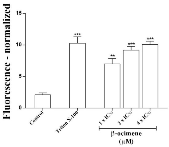 To determine possible damage to the parasite membrane, membrane permeability assays were performed. A significant increase in permeability was observed (via fluorescent signal) in promastigotes treated with β-ocimene at IC50 (p < 0.01), 2 × IC50 (p < 0.001), and at 4 × IC50 (p < 0.001), similar to the positive control—promastigotes were treated with 0.1% Triton X-100 (Figure 1).
