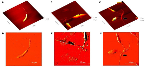 Morphological analysis of Leishmania amazonensis using atomic force microscopy (above: 2D amplitude images; below: 3D height images). (A,D): control (untreated); (B,E): β-ocimene treated (IC50); (C,F): treated with β-ocimene (2 × IC50). Black arrow: ultrastructural alteration.