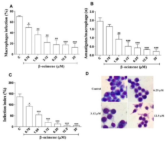 Effect of β-ocimene in the treatment of RAW 264.7 macrophages infected with Leishmania amazonensis for 72 h. (A) Percentage of infected macrophages; (B) number of amastigotes per infected macrophage; (C) infection index, and (D) digital optical microscopy photograph (1000× magnification) of a representative experiment after 72 h of treatment. Macrophages RAW 264.7 attached to 13 mm coverslips were infected with 106 Leishmania amazonensis promastigotes for each macrophage. Afterwards, they were treated with different concentration of β-ocimene at 37 °C and 5% CO2 for 72 h. After this treatment, the coverslips were stained and analyzed using light microscopy. The graph represents the mean ± standard error of the mean of three independent experiments performed in triplicate. One-way ANOVA followed by Tukey’s post-test was performed for comparison between groups with (*) p < 0.05; (**) p < 0.01 and (***) p < 0.001 compared to control. C—Control (0.5% DMSO in complete DMEM).