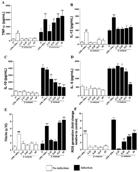 Levels of TNF-α (A), IL-12 (B), IL-10 (C), IL-6 (D) cytokines, and NO (E) and ROS (F) produced by RAW 264.7 macrophages uninfected and infected with Leishmania amazonensis and treated with β-ocimene for 72 h at 37 °C and 5% CO2. The results represent means ± standard error for three independent experiments carried out in triplicate. (#) p < 0.05 vs. uninfected control; (##) p < 0.01 vs. uninfected control; (###) p < 0.001 vs. uninfected control; (**) p < 0.01 vs. infected control; (***) p < 0.001 vs. infected control. C—control. LPS—lipopolysaccharide.