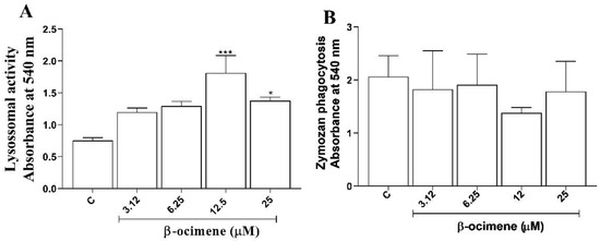 The influence of β-ocimene on the lysosomal volume (A) and phagocytic activity (B). RAW 267.4 macrophages were treated at a range of concentrations for 72 h. Lysosomal activity was analyzed spectrophotometrically by quantifying the increase in neutral red (NR) uptake following solubilization with the extraction solution. The phagocytosis was analyzed by incorporation of NR-stained zymosan, solubilized with the extraction solution. Data are presented as mean ± S.E.M. of three experiments carried out in triplicate. (*) p < 0.05 vs. control; (***) p < 0.001 vs. control. C—control.