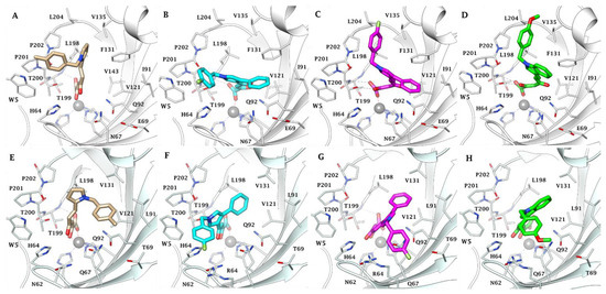 Predicted binding mode of pyrrolyl and indolyl α-γ-diketo acid derivatives 1c, 3a, 5 and 7 to CA II and CA IX. Active site view of CA II (white ribbon) in adduct with 1c (A), 3a (B), 5 (C) and 7 (D). Active site view of CA IX (light blue ribbon) in adduct with 1c (E), 3a (F), 5 (G) and 7 (H). The zinc(II) ion is represented as a grey sphere bound to the protein ligands H94, H96 and H119. H-bonds are represented as black dashed lines.