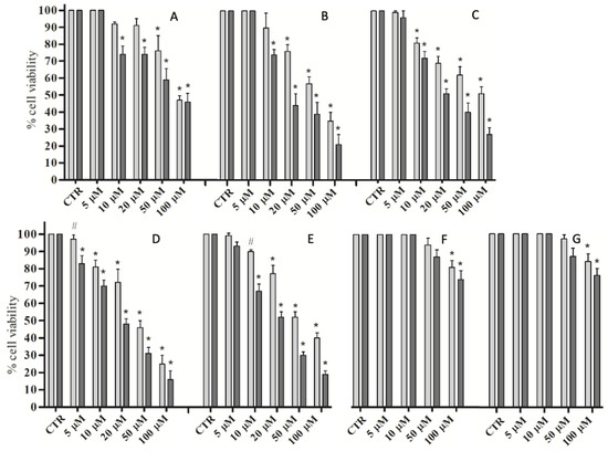 Proliferation assay of Fadu (A–E) and HaCaT (F,G) cells untreated (CTR) and treated with compound 1b (A), 1c (B), 5 (C), 8 (D,F) and 7 (E,G) for 24 h (light gray) and 48 h (dark gray). The values are expressed as percentages of alive cells ± SD. # p < 0.01; * p < 0.001.