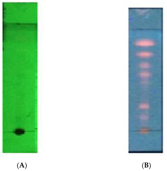 TLC chromatogram pattern of CLSE under UV wavelengths of 254 nm (A); and UV wavelengths of 366 nm (B).