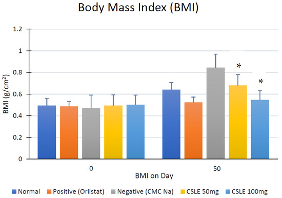 The normal control group showed up to 33.98% of initial body weight, whereas the negative control increased to 54%. The orlistat group had an increased percentage of body weight of up to 27.77%, but in line with the BMI results, CSLE doses of 50 mg/kgbw and 100 mg/kgbw showed a lower percentage change in body weight, at 28.59% and 24%, respectively. The result indicates that CSLE doses can inhibit the weight increase induced by HFD. However, these values were not significantly different compared to the positive control groups (* p < 0.05). This suggests that both doses of CSLE can inhibit the increase of body weight in animals with HFD induction.