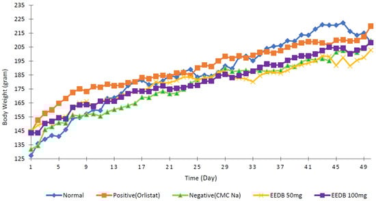 There is no significant difference in BMI value for all groups on day 0. There were no significant differences shown between the positive control (Orlistat) and CSLE dose 100 mg/kgbw on day 50 (* p < 0.05). The results demonstrated that BMI for all groups on day 0 was not significantly different (p < 0.05) and was classified as normal with a BMI range of 0.49 to 0.50. However, a BMI increase was observed in all groups on day 50, after 50 days of HFD induction and 20 days of treatment. The BMI of the orlistat group has the lowest value (0.52), while the negative control given HFD induction for only 50 days without any treatment has the highest value (Figure 2). Another promising finding was the CSLE doses of 50 mg/kgbw and 100 mg/kgbw at BMI values of 0.68 and 0.57, respectively. These values were not significantly different compared to a positive and normal control group (p < 0.05). Therefore, the doses of CSLE can inhibit the increase of BMI in animals with HFD induction. The body weights of rats were observed each day during the HFD induction period from day 0 to 50 (Figure 3).
