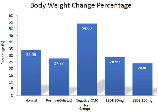Body weight change percentage of each group after 50 days of HFD induction and 20 days of treatment compared to day 0.