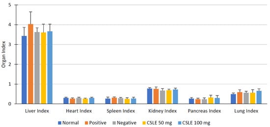 Figure 5 shows the average organ index of rats in each group. An increase in liver organ index in the orlistat group was observed after the treatment. The data also show an increase in the pancreas index of CSLE at doses of 50 mg/kgbw and 100 mg/kgbw, which is higher than for the normal group. The index provides a general description of the effect of the compound on several organs. It cannot be used as an assay of the damage or the improvement of organ function and should be followed by a histopathology assessment.