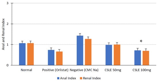 As an antiobesity agent, orlistat plays a role in reducing fat absorption, which can minimize animal fat storage better than the normal group, as shown in Figure 6. The CSLE dose of 50 mg/kgbw showed decreased fat storage compared to the negative group. However, the CSLE dose of 100 mg/kgbw showed a decrease in renal and anal fat deposits (Figure 6). These values were not significantly different compared to the positive control groups (* p < 0.05). The results confirm that a CSLE dose of 100 mg/kgbw can decrease renal and anal fat deposits.