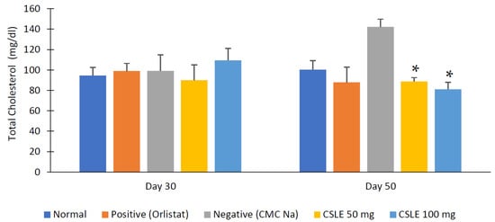 The total cholesterol and triglyceride levels were observed before the drug treatment (day 30) compared to the last day as can be shown in Figure 7 and Figure 8, respectively. The total cholesterol and triglyceride levels of the orlistat group and the CSLE dose of 50 mg/kgbw and 100 mg/kgbw were decreased on day 50. These values were not significantly different compared to the positive control groups (* p < 0.05). This is probably because of the lipase inhibition activity of orlistat and CSLE as enzymes involved in lipid hydrolysis, resulting in decreased total cholesterol and triglyceride levels. The results show the potential effect of CSLE in lowering total cholesterol and triglyceride levels compared to orlistat as a positive control.