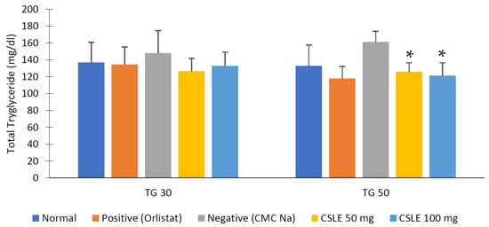 Total triglyceride value. Data represent mean ± SD (n = 5). CSLE dose 50 and 100 mg/kgbw and orlistat group are not significantly different (* p < 0.05) by the ANOVA test.