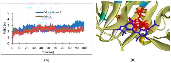 (A) Graphic of Root Mean Square Deviation (RMSD) of caloxanthone B and orlistat; (B) 3D interaction of caloxanthone B (Blue) and orlistat (Red) to fat mass and obesity-associated protein (FTO).