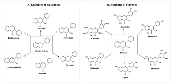 Numerous studies have shown that flavonoids can prevent the development of cancer [8,9]. Flavonoids are secondary metabolites classified under the group of polyphenolic compounds. These naturally existing compounds are commonly dispersed in a plant’s leaf, stem, and root [10,11]. They exhibit remarkable outcomes in the human body, including anti-allergic, antioxidant, anti-inflammatory, and antiviral activities [12,13]. Moreover, flavonoids have been found to inhibit the proliferation, growth, and metastasis of breast cancer in vitro as well as in animal models [14,15]. Its use as an anti-carcinogenic agent is attributed to its antioxidant and anti-inflammatory properties [16]. Flavonoids interfere with multiple signal transduction pathways that occur during carcinogenesis, thereby reducing proliferation, angiogenesis, and metastasis, or increasing apoptosis, making them potential anticancer agents. However, its dose-dependent pharmacokinetics and low-dose potency contribute to some therapeutic obstacles [17,18]. Based on their structure, flavonoids are classified into six categories, viz., flavonol, flavanone, flavanol, flavone, anthocyanidin, and isoflavonoid. Quercetin, kaempferol, fisetin, myricetin, galangin, and casticin are flavonols with anticancer properties (Figure 1).