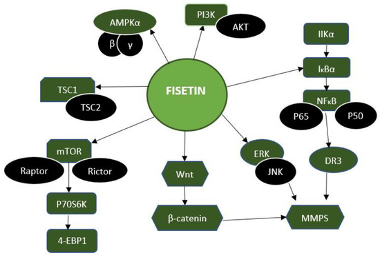 Fisetin rapidly compromises the proteasome-dependent microtubule drug-induced mitotic inhibition in numerous cell lines. As a result, chromosomal segregation begins early and, in unaffected tumour cells, leaves mitosis without typical cytokinesis. A cell culture study that looked at how fisetin affected the phosphorylation and localization of various mitotic proteins found that when it was introduced to the media, Cenp-F, Bub1, BubR1, and Aurora B soon lost their localization to the kinetochore and centromere. In addition, fisetin’s primary target was Aurora B kinase, whose activity is essentially decreased by fisetin in vitro [44]. Fisetin works on several cellular pathways, such as Wnt, Akt-PI3K, and ERK, as an inhibitor (Figure 4).