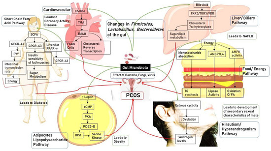 Intestinal fermentation of complex carbohydrates requires interactions among members of the microbiome community, which comprise both nutritionally specialized and generally adapted species. Many genes, encoding carbohydrate-active enzymes, are found in certain dominating species, particularly among the Bacteroidetes. This enables them to quickly switch between different energy sources in the gut, based on the source availability. This is attributed to their sophisticated sensing and regulatory processes that control gene expression [118].. Kocelak and coworkers studied the resting energy expenditure (REE), body composition, and the gut microbial population in 50 obese and 30 lean, healthy, weight-stable subjects. They found that obese people had a significantly higher total microbial count, but no significant variations in the Bacteroidetes/Firmicutes ratio was found, which had previously been reported to be lower in obese people in other investigations [119]. The gut microbiota can aid in the usage of calories from consumed foods. Turnbaugh et al. found that the obese (ob/ob) mouse microbiota, whether present in ob/ob or gnotobiotic mice, had a higher potential to harvest energy from the food. More importantly, transplanting an obese mouse’s caecal microbiota into gnotobiotic mice resulted in enhanced energy harvesting, as well as increased intestinal monosaccharide absorption. As a result, hepatic lipogenesis got enhanced, and hepatic lipoprotein lipase (LPL) as well as sterol regulatory element-binding proteins (SREBPs) were stimulated [120]. The link between gut microbiota, energy metabolism, and obesity was validated in this investigation. Over half of PCOS individuals were overweight or obese, according to data in the study [121].
