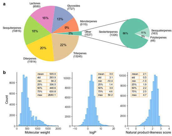 (a) Overview of absolute and relative counts of terpene subclasses. (b) Distribution of molecular weight, natural product-likeness score and logP for all terpenes in the dataset. For the sake of clarity, we have chosen only molecular weights up to 2000 and −12 < logP < 20, with only 0.2% and 0.1% of the molecules being suppressed, respectively.