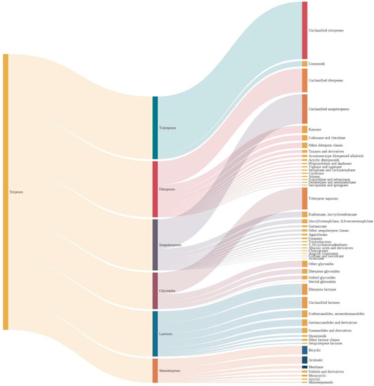 Classification of terpenes in the COCONUT database. The second level of classification corresponds to classical phytochemical subclasses (monoterpenes, diterpenes, sesquiterpenes, among others), while the last level corresponds to characteristic nuclei or subsets.