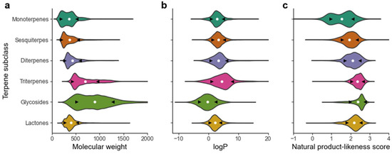 Distribution of (a) molecular weight, (b) logP and (c) natural product-likeness score across different terpenes subclasses. White mark (•) represents the mean. Left black arrow represents the mean—std and the right arrow the mean + std.