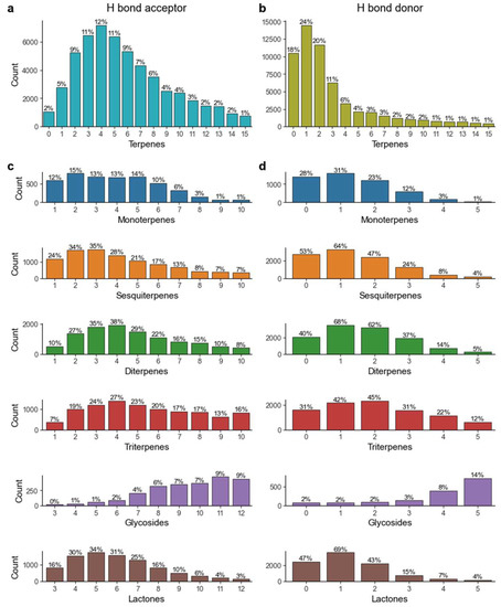Number of hydrogen bond (a) acceptors and (b) donors in the terpene chemical space and on a subclass basis for (c) acceptors and (d) donors.