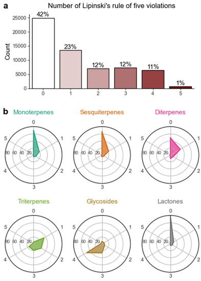 (a) Number of violations of Lipinski’s rule of five in the terpene chemical space, for all terpenes, and (b) across distinct subclasses; outer values correspond to the number of violations and inner values the percentage of a given number of violations.